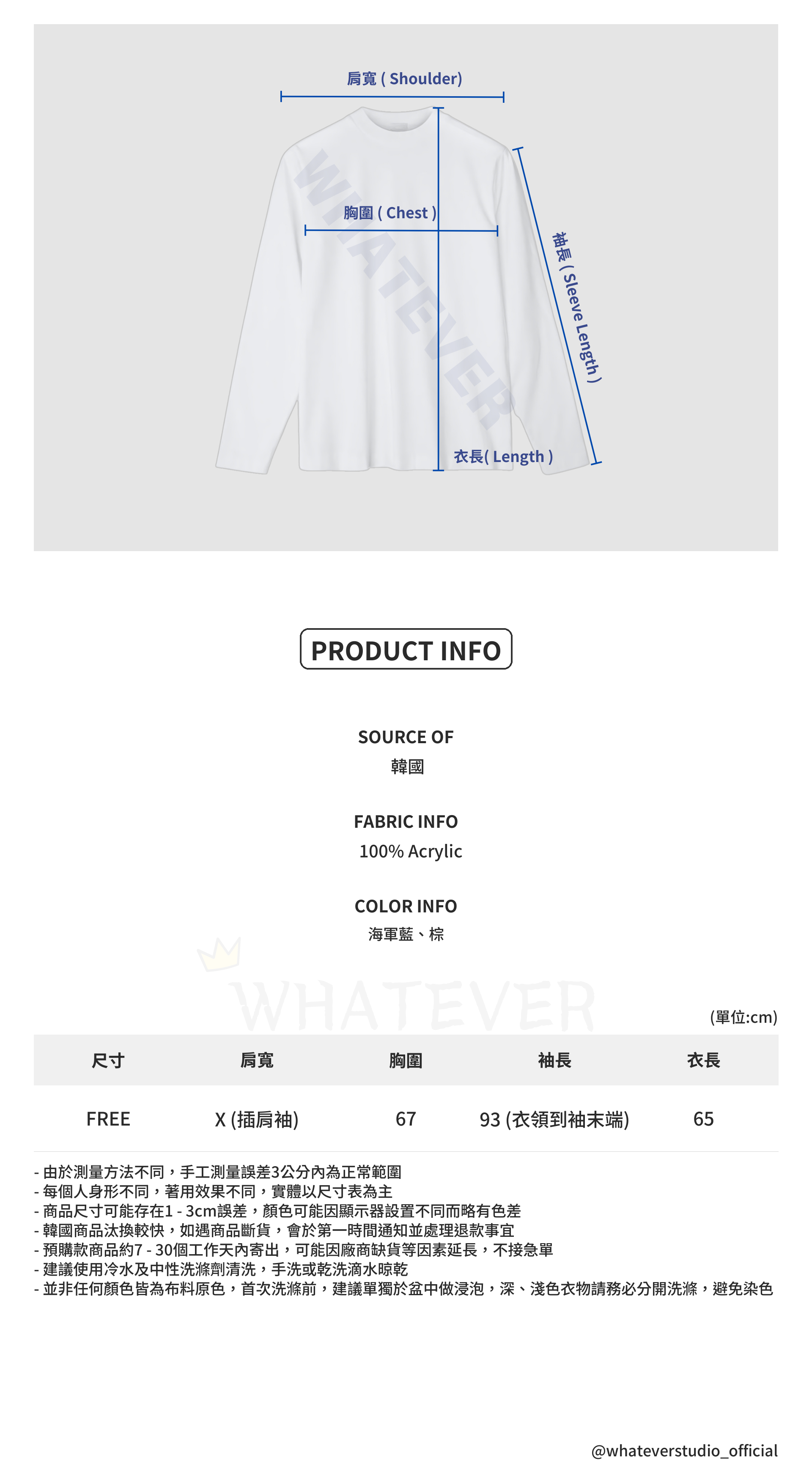 - FREE : 肩寬 X (插肩袖) / 胸圍 67 / 袖長 93 / 衣長 25