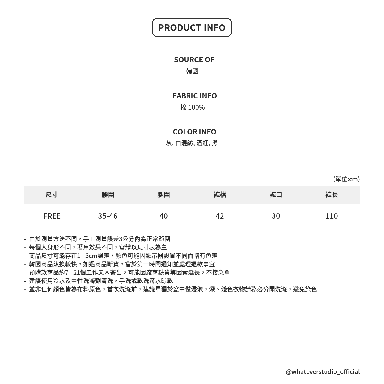 FREE : 腰圍 35~46 (鬆緊) / 腿圍 40 / 褲檔 42 / 褲口 30 / 褲長 110