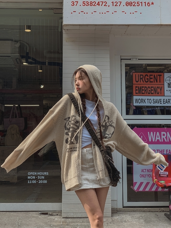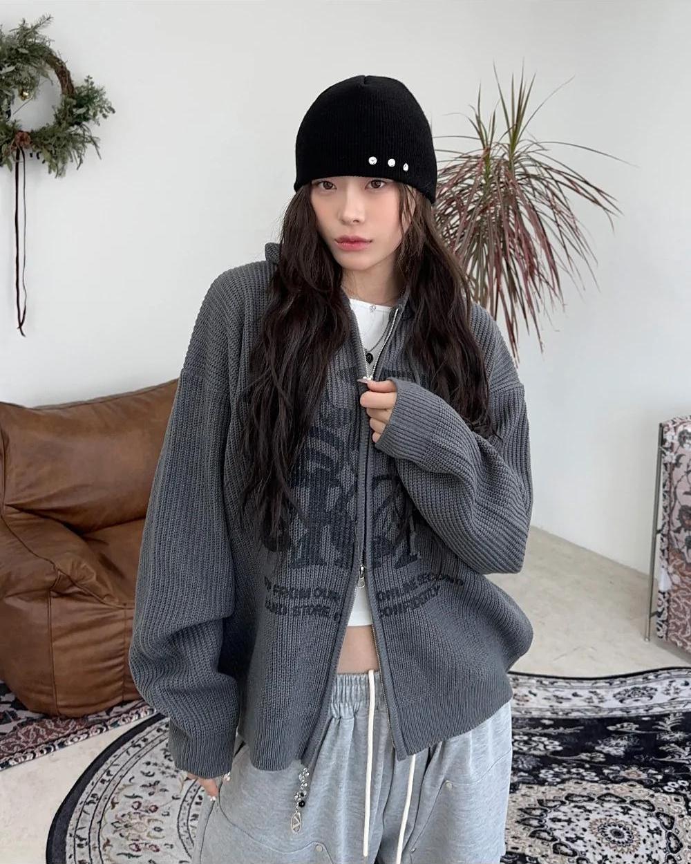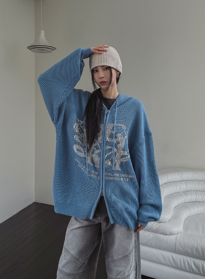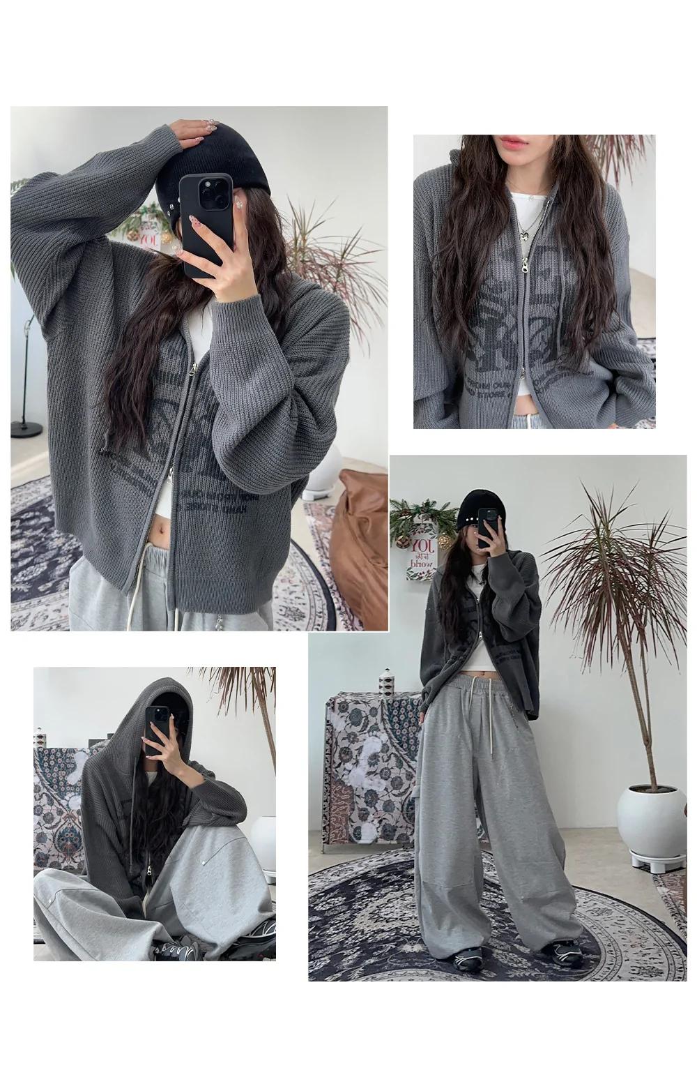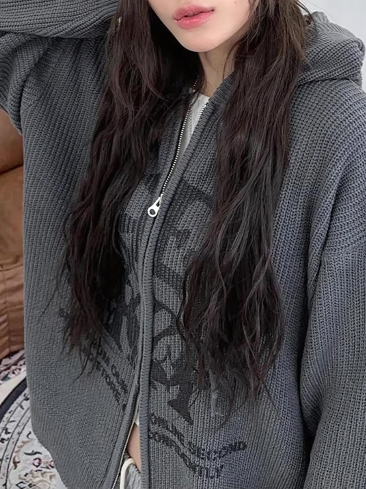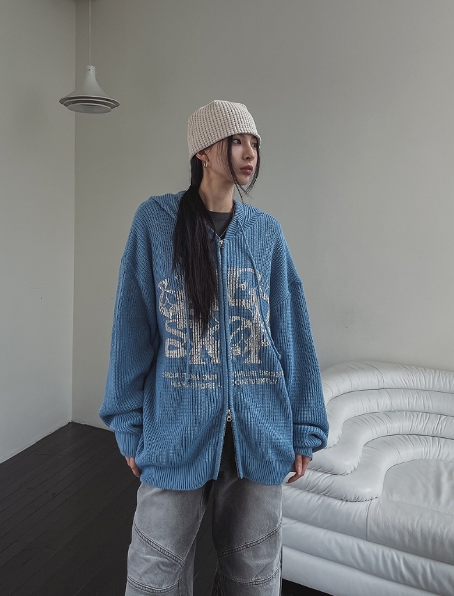 星星 字母印花 雙拉鍊 連帽 針織外套 / 4色