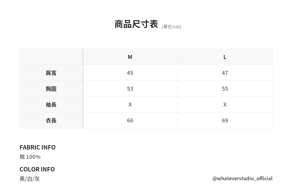 L : 肩寬 47 / 胸圍 55 / 袖長 X / 衣長 69