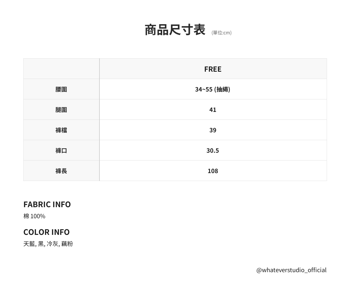 FREE : 腰圍 34~55 (抽繩) / 腿圍 41 / 檔長 39 / 褲口 30.5 / 褲長 108