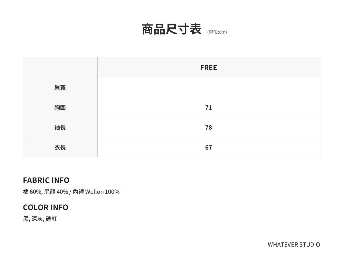 FREE : 肩寬 X / 胸圍 71 / 袖長 78 / 衣長 67