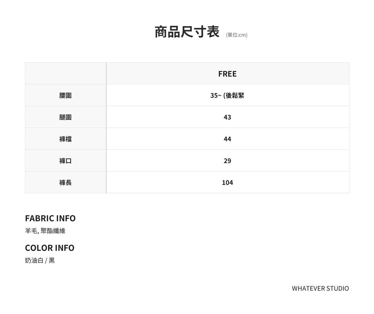 FREE : 腰圍 35~ (後鬆緊 / 腿圍 43 / 檔長 44 / 褲口 29 / 褲長 104